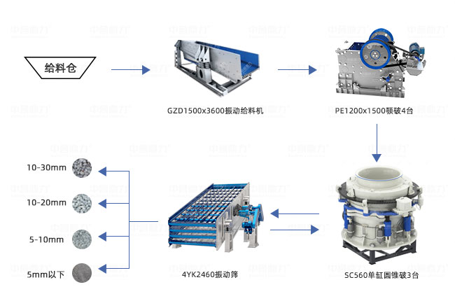 主機(jī)設(shè)備包括GZD1500x3600振動(dòng)給料機(jī)、PE1200x1500顎破4臺(tái)、SC560單缸圓錐破3臺(tái)、4YK2460振動(dòng)篩。