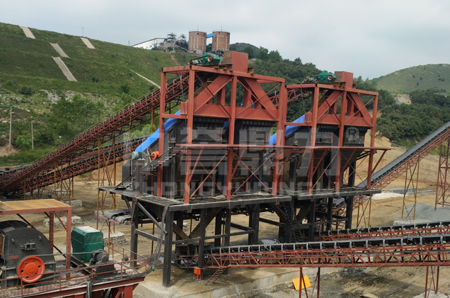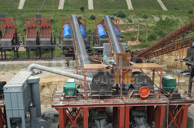 日產4萬噸的砂石生產線設備配置方案有兩種,一種方案是單臺主破+兩臺二破組成的一條生產線,另一種是多臺主破+多臺二破組成的兩條生產線同時運行。