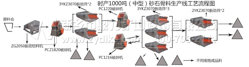 由一臺振動給料機均勻給料,進入破碎設備進行物料破碎,破碎物料接著進入振動篩進行篩分,不滿足粒度物料直接進入下破碎設備進行再次破碎。可以根據成品料顆粒粒度的需求增加破碎設備和篩網不同孔徑的振動篩進行砂石生產線砂石物料的生產。可以看出此條生產線生產物料為顆粒比較細小砂石料。