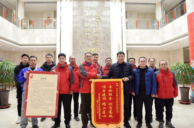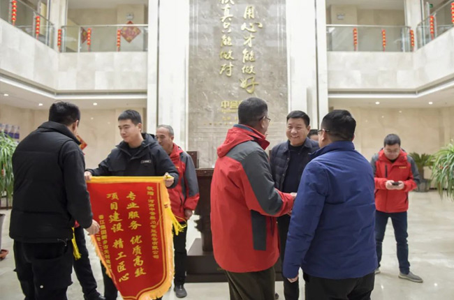 1月16日下午,中譽(yù)鼎力總經(jīng)理?xiàng)钋⒏笨偨?jīng)理陳樹(shù)凱、銷(xiāo)售經(jīng)理趙元?jiǎng)偌绊?xiàng)目工程師接收天利建材導(dǎo)送來(lái)的感謝信和錦旗,并合影留念。