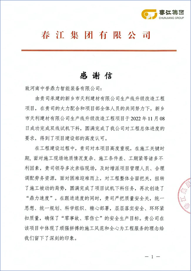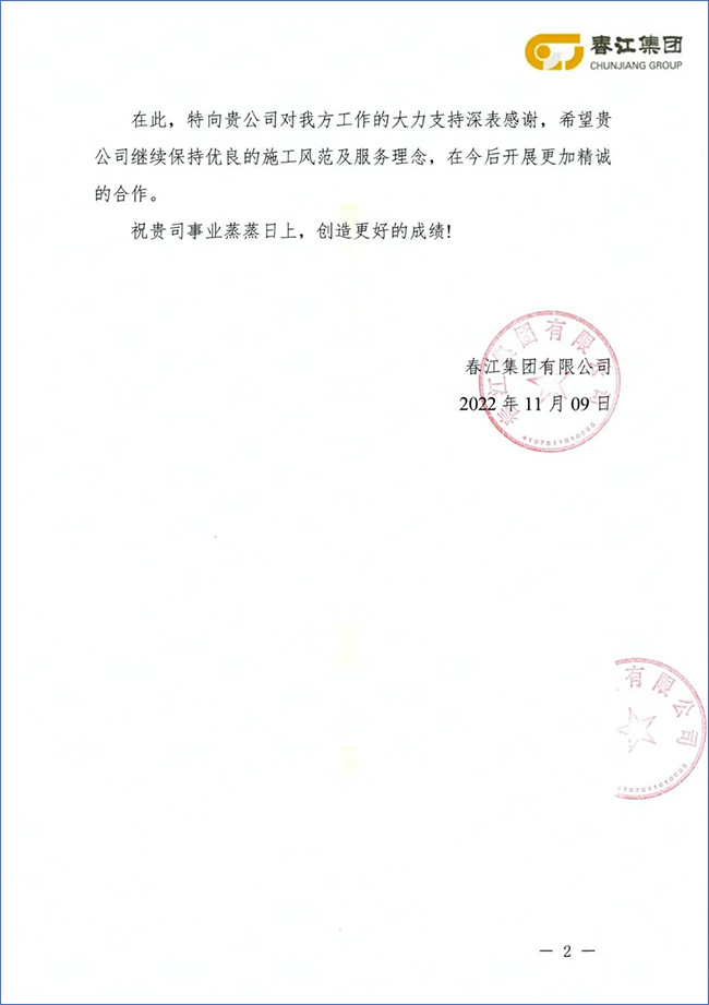來(lái)信對(duì)公司EPC承建項(xiàng)目施工安裝的高效,