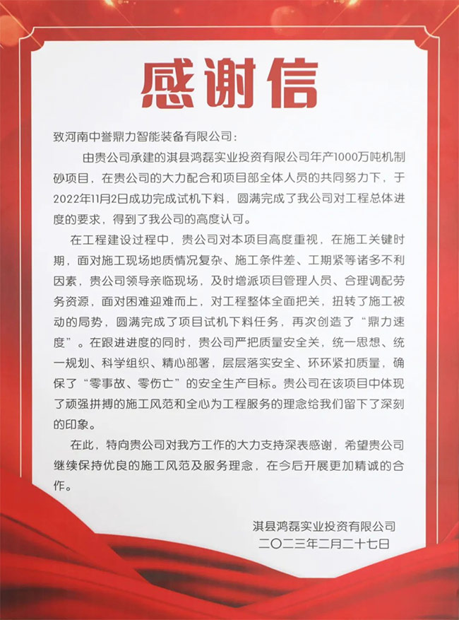 今后,中譽(yù)鼎力將以榮譽(yù)為起點(diǎn),以責(zé)任為基石,繼續(xù)秉承“認(rèn)真只能做對(duì),用心才能做好”的工作理念和“快捷 智慧 運(yùn)營(yíng),打造全生命周期礦山管理新模式”的定位,為客戶(hù)提供精工匠心、優(yōu)質(zhì)高效、專(zhuān)業(yè)誠(chéng)信、合作共贏的建材項(xiàng)目EPCO總承包服務(wù),創(chuàng)造更多價(jià)值!