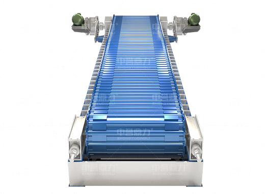 電動(dòng)機(jī)轉(zhuǎn)動(dòng),通過傳動(dòng)軸和驅(qū)動(dòng)裝置,帶動(dòng)主軸旋轉(zhuǎn),鏈輪和鏈條安裝在主軸裝置上,通過該裝置帶動(dòng)鏈條上的鏈板做直線運(yùn)動(dòng),鏈條上安裝有承料槽板,鏈板的直線運(yùn)動(dòng)將物料均勻的帶到鏈條的槽板上,并向前輸送,達(dá)到輸送物料的目的。