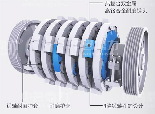 八路錘軸孔,四路備用,機體設觀察門,方便觀察運轉情況,配備液壓抽軸器,方便更換錘頭、錘軸,件均采用螺栓緊固,拆卸方便,減少維護時間成本。