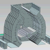 機(jī)殼采用雙腔對稱設(shè)計(jì),可一次性容納更多物料,提高破碎產(chǎn)量,工作時(shí),電機(jī)帶動(dòng)錘頭高速運(yùn)轉(zhuǎn),對從上方落入的物料形成沖擊力,此時(shí)的物料獲得動(dòng)能后高速撞向機(jī)腔內(nèi)壁的反擊板,造成物料的次破碎,從物料進(jìn)入機(jī)腔便相互碰撞形成自粉碎,物料在多次撞擊、研磨作用下達(dá)到所需粒度,從機(jī)腔側(cè)下方出料口排出,完成破碎過程。