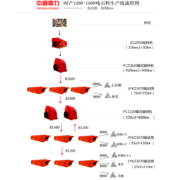 • 設備配置:ZG2050振動給料機、PCZ1820重型錘式破碎機、4YKZ3070振動篩*3臺、PC1220錘式破碎機等