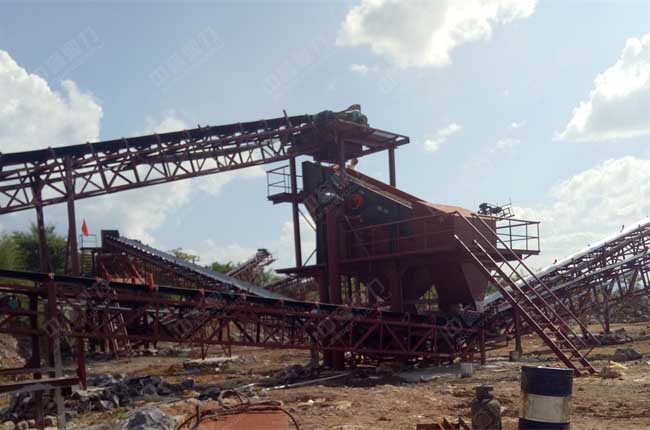 石料由ZGC1038振動給料機均勻地送到頭破(PCZ1510重型錘式反擊破碎機)進行粗破,粗破后的物料由膠帶輸送機送入到二破(XPC0808錘式破碎機)進行細碎,細碎后的物料被輸送到一組并篩2YKQ2060振動篩進行篩分,篩分出1-3、1-2、0-5和石粉四中成品料,由輸送帶送到成品料堆。成品粒度可按用戶的需求進行組合和分級。