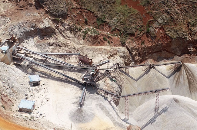 高鈣石在震動喂料機的作用下,被勻稱的送入重型錘破內(nèi)進行粗破處置,后進入輕型篩機進行篩選分級,大塊物料被返料帶返回碎石機進行進行再一次處置,經(jīng)二次粉碎后的高鈣石在傳送機的作用下被送入機制砂設(shè)備進行更細的處置,制砂后的高鈣石經(jīng)過篩機篩選分級,達標(biāo)的高鈣石粒型在篩機的作用下,被分成四種不一樣的粒級,在傳送機的作用下被輸出。