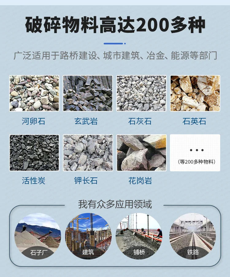 適應物料:硬質物料花崗巖、玄武巖、大理石以及風化巖、石灰石、青石等低硬度物料